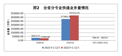 2022年,同城365体育网址_365scores下载_365app手机版官方业务量累计完成27263.86万件,同比下降19.84%;异地业务量累计完成325314.29万件,同比增长17.15%;国际/港澳台业务量累计完成660.63万件,同比下降31.11%。