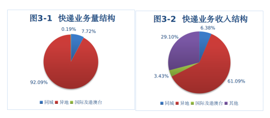 2022年,同城、异地、国际/港澳台365体育网址_365scores下载_365app手机版官方业务量分别占全部365体育网址_365scores下载_365app手机版官方业务量的7.72%、92.09%和0.19%;业务收入分别占全部365体育网址_365scores下载_365app手机版官方收入的6.38%、61.09%和3.43%。与去年同期相比,同城365体育网址_365scores下载_365app手机版官方业务量比重下降3.16个百分点,异地365体育网址_365scores下载_365app手机版官方业务量比重上升3.28个百分点,国际/港澳台业务量比重下降0.12个百分点。