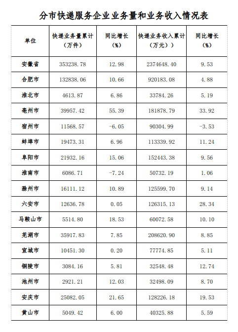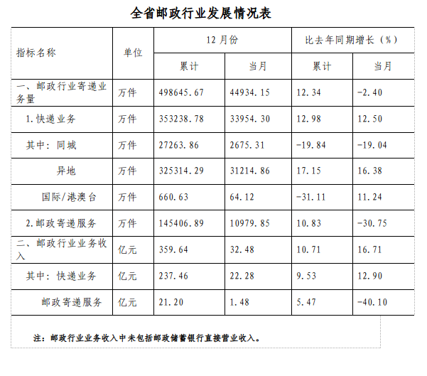 12月份,邮政行业业务收入(不包括邮政储蓄银行直接营业收入)完成32.48亿元,同比上升16.71%。其中,365体育网址_365scores下载_365app手机版官方业务收入完成22.28亿元,同比上升12.90%;邮政寄递服务业务收入完成1.48亿元,同比下降40.10%。