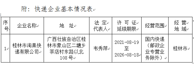 根据《中华人民共和国行政许可法》《中华人民共和国邮政法》《365体育网址_365scores下载_365app手机版官方业务经营许可管理办法》等有关规定,经按程序审查,同意下列企业的《365体育网址_365scores下载_365app手机版官方业务经营许可证》有效期到期延续的申请,延续有效期为五年,现将企业相关信息予以公告。