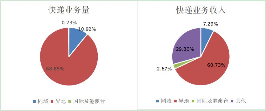 1-12月,同城、异地、国际/港澳台365体育网址_365scores下载_365app手机版官方业务量分别占全部365体育网址_365scores下载_365app手机版官方业务量的10.92%、88.85%和0.23%;业务收入分别占全部365体育网址_365scores下载_365app手机版官方业务收入的7.29%、60.73%和2.67%。与去年同期相比,同城365体育网址_365scores下载_365app手机版官方业务量的比重下降1.71个百分点,异地365体育网址_365scores下载_365app手机版官方业务量的比重上升1.82个百分点,国际/港澳台365体育网址_365scores下载_365app手机版官方业务量的比重下降0.11个百分点。