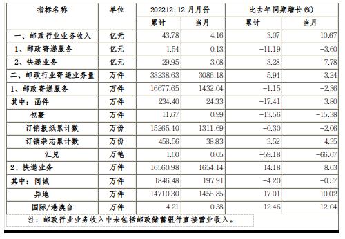 海南省邮政管理局公布2022年12月邮政行业运行情况
