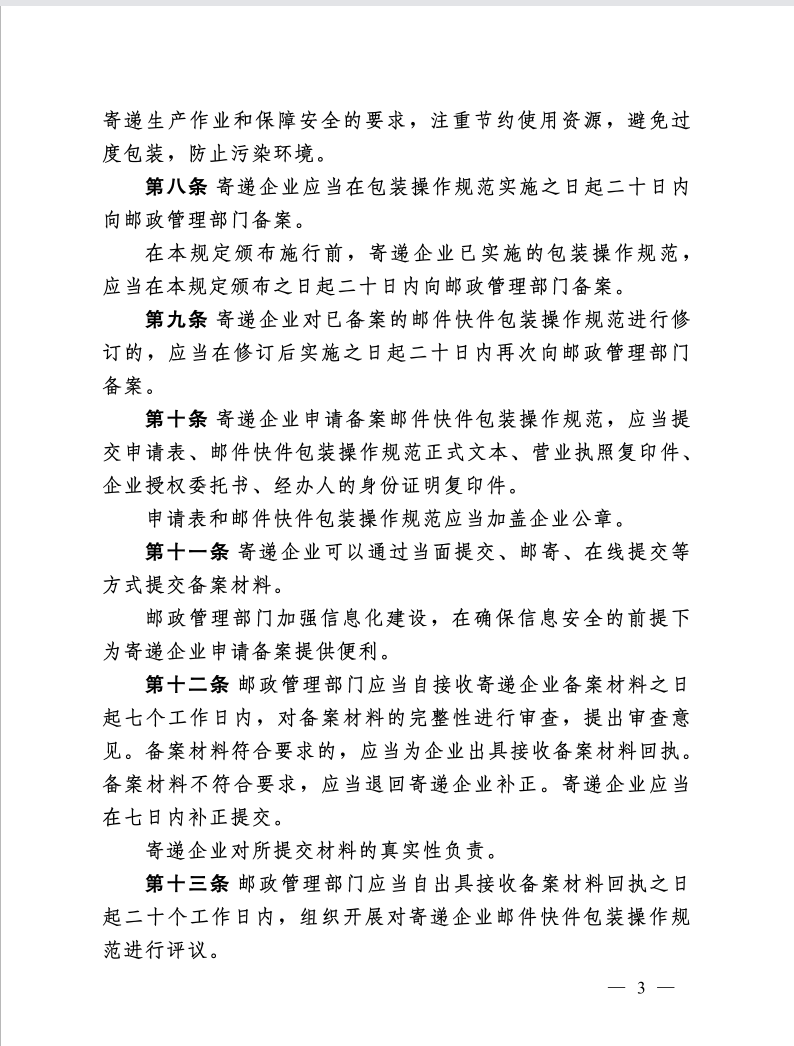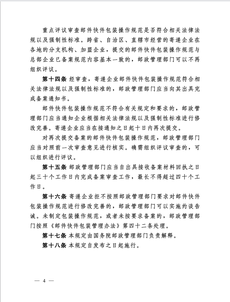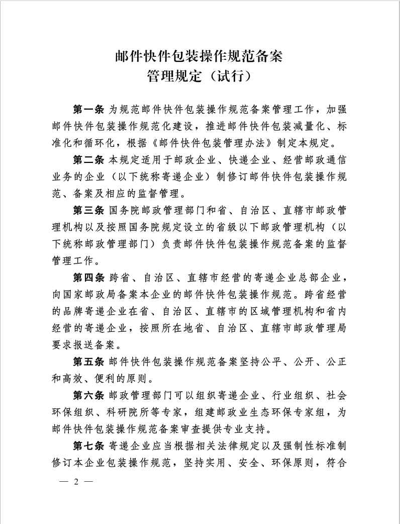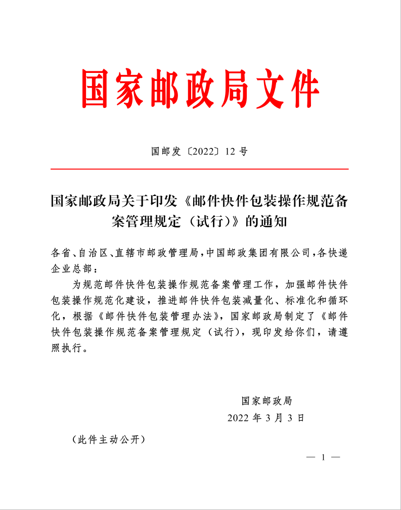 国家邮政局关于印发《邮件快件包装操作规范备案管理规定(试行)》的通知