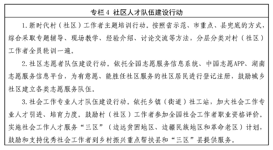 7.加强社区服务教育培训。加强城乡社区服务人才培训管理,建立健全村(社区)工作者能力指标体系。坚持省级示范培训、市级重点培训、县级兜底培训,整合教育培训资源,用好现有培训基地和在线培训平台。依托各级各类干部网络培训平台开放共享社区服务精品课程,推动优质培训资源直达村(社区)。实行“导师帮带制”,推动新任村(社区)工作者导师帮带全覆盖,提升村(社区)工作者政治理论水平和依法办事、执行政策、服务群众、应急处置等能力。鼓励政府购买服务资金优先支持有条件的院校开展城乡社区服务相关人才培养和村(社区)工作者能力提升培训。加强对村(社区)工作者的民族、宗教政策法规培训。结合农民工自身特点开展职业技能培训,引导农民工从事城乡社区服务业。