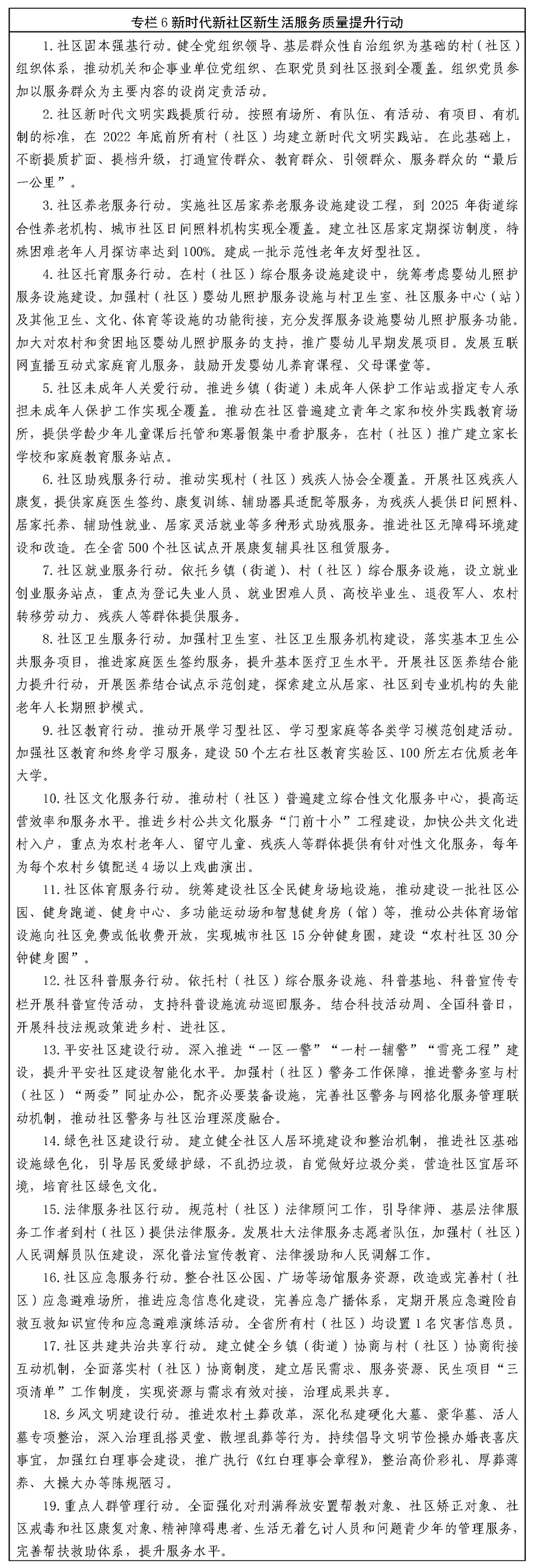 到2025年末,党建引领城乡社区服务体系建设更加完善,服务主体和服务业态更加丰富,服务手段更加智能,精准化、精细化水平持续提升,村(社区)为民、安民、便民功能充分发挥,人民群众操心事、烦心事、揪心事更好解决,获得感、幸福感、安全感不断增强。