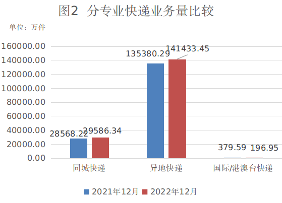 2022年,同城业务量累计完成2.96亿件,同比增长3.56%;异地业务量累计完成14.14亿件,同比增长4.47%;国际及港澳台业务量累计完成196.95万件,同比下降48.11%。