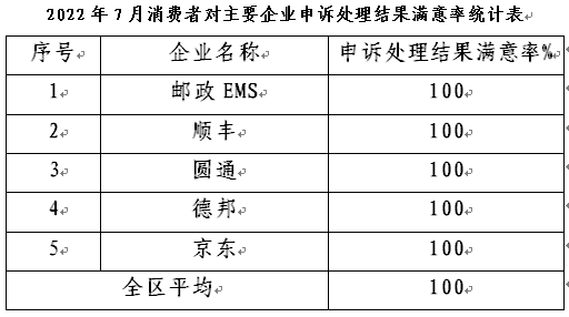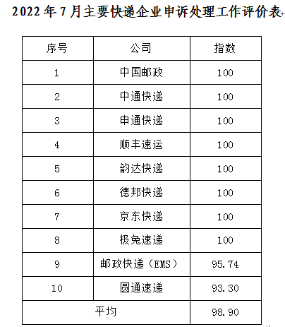 2022年7月,10家主要365体育网址_365scores下载_365app手机版官方企业申诉处理工作综合指数平均为98.9%,高于平均数的365体育网址_365scores下载_365app手机版官方企业有8家,邮政EMS、圆通365体育网址_365scores下载_365app手机版官方2家365体育网址_365scores下载_365app手机版官方企业低于平均数。