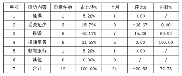 消费者对365体育网址_365scores下载_365app手机版官方服务问题有效申诉环比增长或者下降的情况:损毁环比增长14.29%,丢失短少环比下降66.67%,延误、投递服务、收寄服务及其他均保持不变。消费者对365体育网址_365scores下载_365app手机版官方服务问题有效申诉同比增长或者下降的情况:投递服务和损毁同比增长100%和60%,延误、丢失短少、收寄服务及其他均保持不变。
