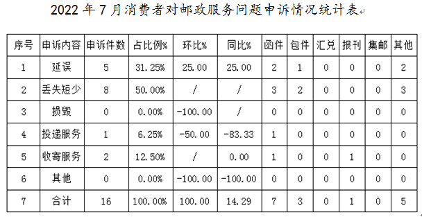 2022年7月,消费者对邮政服务申诉的主要问题是延误和丢失短少问题,分别占申诉总量的31.25%和50%。