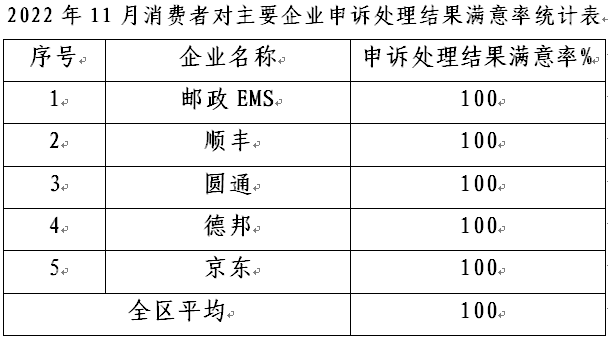 2022年11月,9家主要365体育网址_365scores下载_365app手机版官方企业申诉处理工作综合指数平均为98.99%,高于平均数的365体育网址_365scores下载_365app手机版官方企业有7家,中国邮政、邮政(EMS)2家365体育网址_365scores下载_365app手机版官方企业低于平均数。