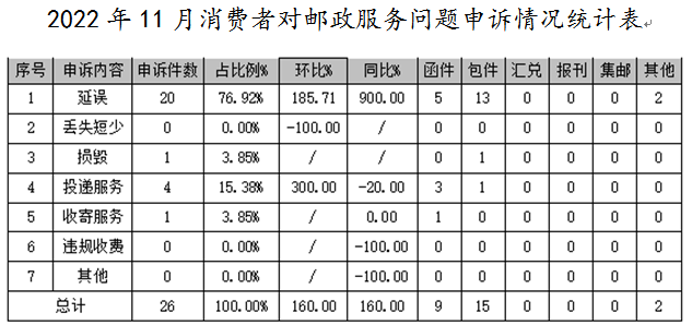 消费者对365体育网址_365scores下载_365app手机版官方服务问题有效申诉环比增长或者下降的情况:丢失短少环比增长100%,延误环比下降20%,投递服务环比下降50%,损毁、收寄服务和其他环比均保持不变。