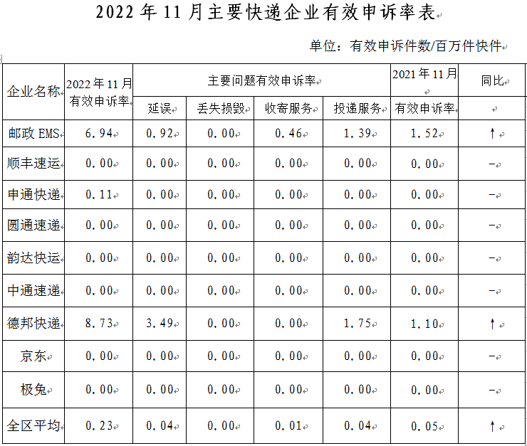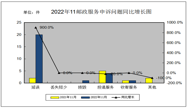 2022年11月,消费者对邮政服务问题有效申诉为0件。