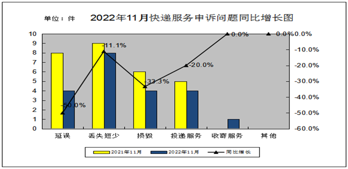 2022年11月,消费者对365体育网址_365scores下载_365app手机版官方服务申诉的主要问题是丢失短少、延误、损毁和投递服务,分别占申诉总量的38.1%、19.05%、19.05%和19.05%。