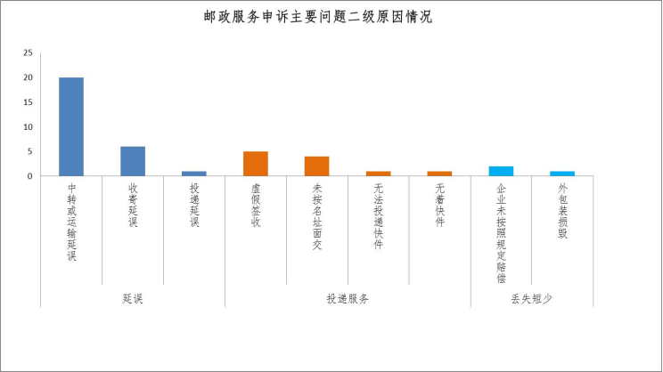 邮件延误申诉中主要占比是中转或运输延误,投递服务申诉中主要占比是虚假签收和未按名址面交。
