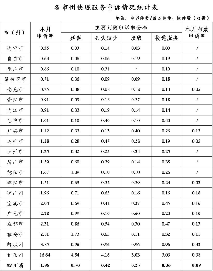 四川省365体育网址_365scores下载_365app手机版官方服务申诉率平均为百万分之1.88,有效申诉率平均为百万分之0.09,用户对365体育网址_365scores下载_365app手机版官方企业申诉主要问题中,损毁申诉率为0.36,延误申诉率为0.70,丢失短少申诉率为0.42,投递服务申诉率为0.27。
