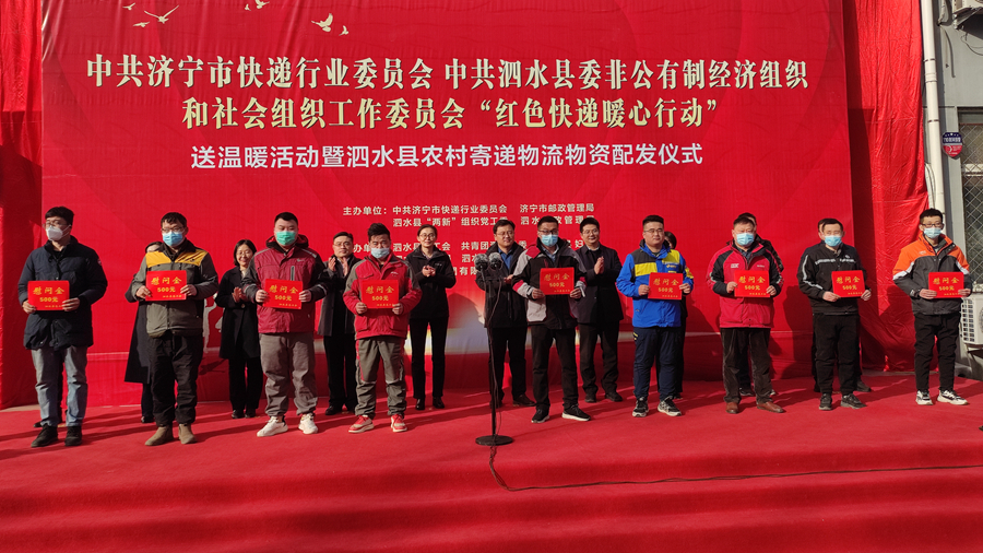 济宁泗水县举行“红色365体育网址_365scores下载_365app手机版官方暖心行动”送温暖活动暨泗水县农村寄递物流物资配发仪式