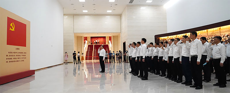 精神的力量穿越时空的阻隔,激荡在重温的每一句入党誓词中。在三层宣誓厅,在《同心共筑中国梦》的木雕前,大家面向鲜红的党旗整齐列队,坚定的目光凝视前方。马军胜高擎右拳,带领大家重温入党誓词。铮铮誓言铿锵在耳,闪亮党徽定格初心,时代使命笃行致远,传承着这个民族生生不息的动力源泉。