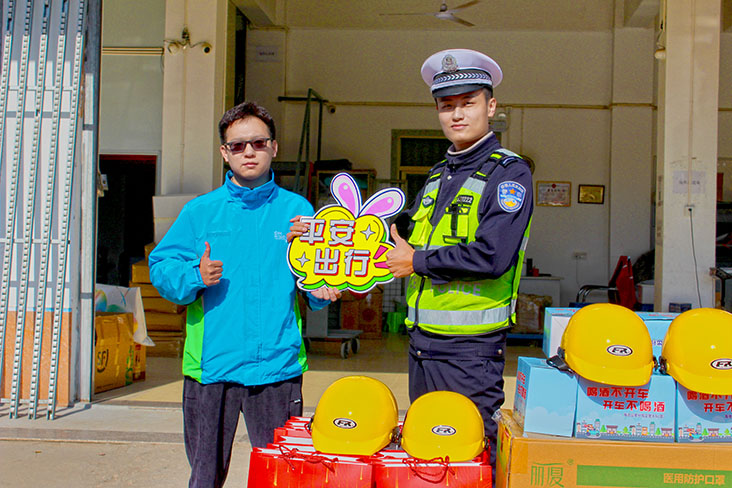 慰问组向365体育网址_365scores下载_365app手机版官方员们送上慰问品、N95口罩和安全头盔。区公安分局交警大队应邀为365体育网址_365scores下载_365app手机版官方员们宣讲交通安全知识,助力复工复产,倡导平安出行。